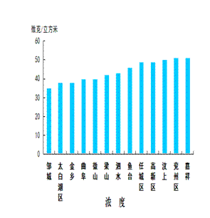 二氧化氮浓度最好的县(市、区)是邹城市,为35微克/立方米;最差的县(市、区)是兖州区和嘉祥县,均为51微克/立方米;同比改善幅度最大的县(市、区)是邹城市,为30.0%,同比改善幅度最小的县(市、区)是太白湖区,与去年持平。