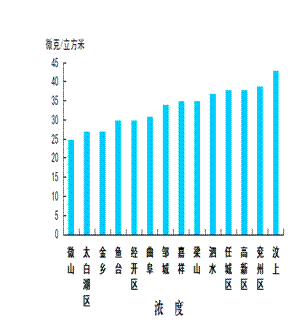 二氧化氮浓度最好的县(市、区)是微山县,为25微克/立方米;最差的县(市、区)是汶上县,均为43微克/立方米;同比改善幅度最大的县(市、区)是曲阜市,为27.9%,同比恶化幅度最大的县(市、区)是泗水县,为5.7%。