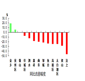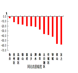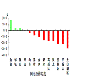 二氧化硫浓度最好的县(市、区)是嘉祥县和梁山县,均为13微克/立方米;最差的县(市、区)是太白湖区,为23微克/立方米;同比改善幅度最大的县(市、区)是鱼台县,为34.6%,同比恶化幅度最大的县(市、区)是金乡县,为45.5%。