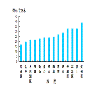 二氧化氮浓度最好的县(市、区)是经开区,为17微克/立方米;最差的县(市、区)是兖州区,为39微克/立方米;同比改善幅度最大的县(市、区)是鱼台县,为17.2%,同比恶化幅度最大的县(市、区)是太白湖区,为29.4%。