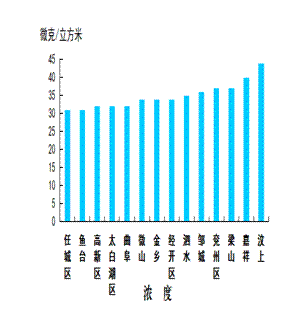 细颗粒物浓度最好的县(市、区)是任城区和鱼台县,均为31微克/立方米;最差的县(市、区)是汶上县,为44微克/立方米;同比改善幅度最大的县(市、区)是任城区,为20.5%,同比恶化幅度最大的县(市、区)是梁山县,为15.6%。