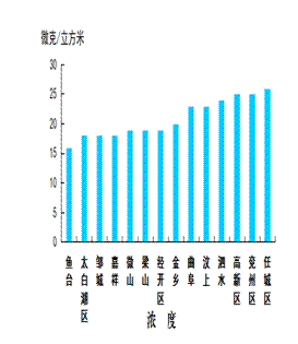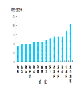 二氧化氮浓度最好的县(市、区)是鱼台县,为16微克/立方米;最差的县(市、区)是任城区,为26微克/立方米;同比改善幅度最大的县(市、区)是鱼台县,为38.5%,同比改善幅度最大的县(市、区)是泗水县,为4.0%。